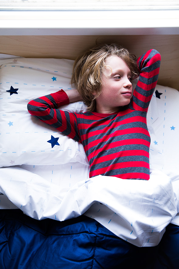 The sheets are super soft, 100% cotton in lots of patterns. We picked out the blue star sheet set here. The ultra light down comforter is warm but lightweight, specially designed to prevent kids from overheating so they stay dry. I swear Henry always wakes up in a sweat so I really appreciate that feature.
