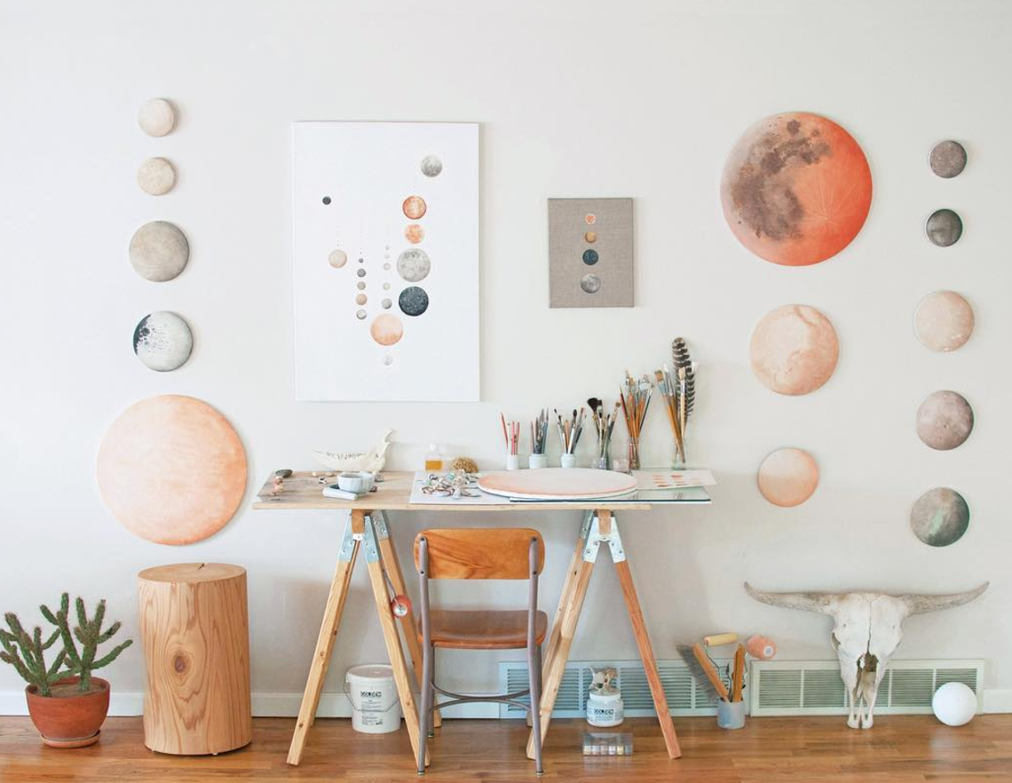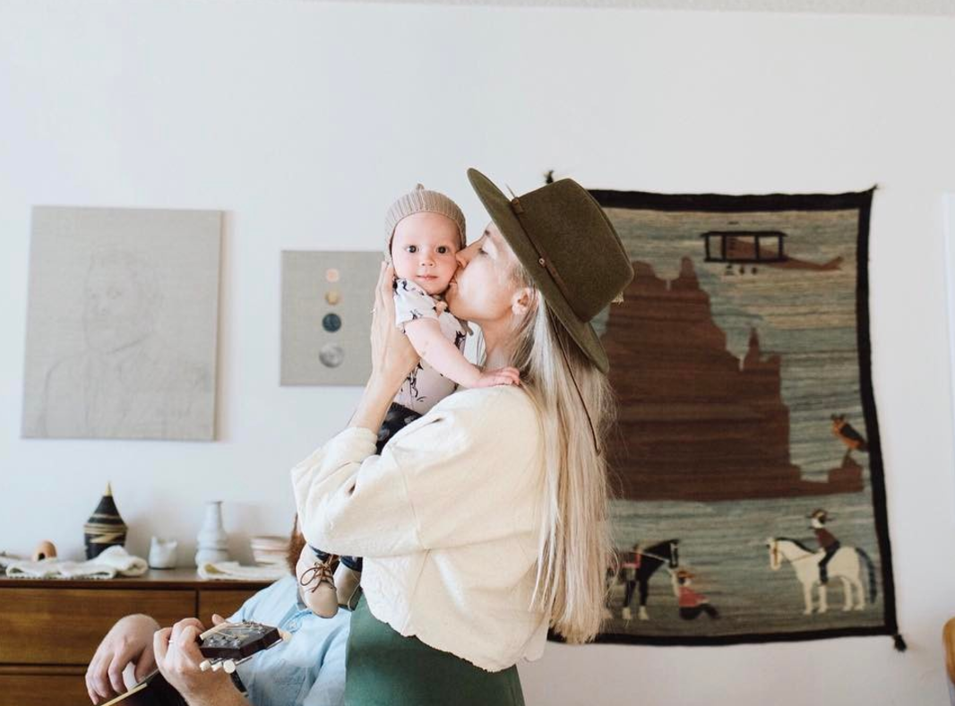 Stella Maria Baer is a favorite artist of mine and a brand new mother to sweet baby Wyeth. I’ve been a huge fan of her moon and planet paintings and the style of her work from her instagram (her own personal style as well), and was excited when I found out we had a couple close friends in common! She happily agreed to let me pick her brain on how motherhood has changed her work, how painting has given her the space to be a better mom and helped her reconnect with her own childhood, and the strange world of instagram fame…